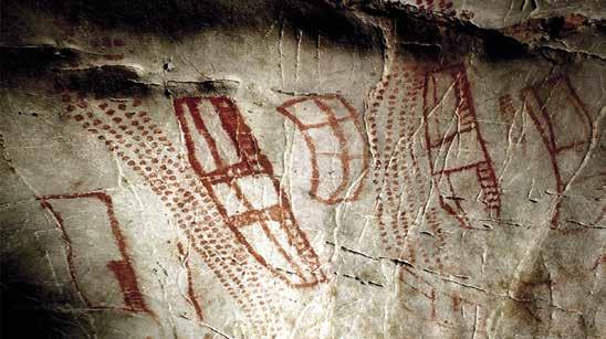 Proč ale šamani malovali i geometrické obrazce, především v podobě mřížek, nakupených oken a žebříků, zůstává utajeno. Britský spisovatel Graham Hancock v knize Hledání nadpřirozena popisuje