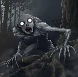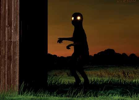 Na dvoře stálo více než dva metry vysoké vyzáblé stvoření. Jeho kůže fluoreskovala mlhavým světlem barvy Měsíce. Na hlavě nemělo vlasy a také tělo bylo úplně holé. Tvář připomínala člověka, ale detaily se nedaly rozeznat. Oči zářily do tmy. Vydalo se to rovnou ke mně. Úplně jsem ztuhnul. Nevím, zda mě to děsivé cosi vidělo nebo ne. Terasa spočívala ve tmě, zatímco na dvorku pod hvězdami bylo jasněji. Každopádně tvor těsně před domem zatočil do pravého úhlu a pochodoval kolem dřevěné stěny. Když mě míjel, zahlédl jsem, že má drsnou kůži na nohou.“