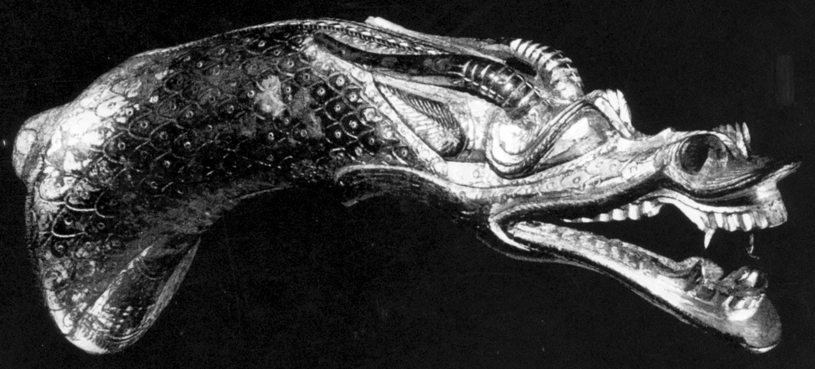 zkažená ryba. Jeho tělo pokrýval pancíř mohutných, jakoby kamenných šupin. Z hlavy vyrůstaly rohy.