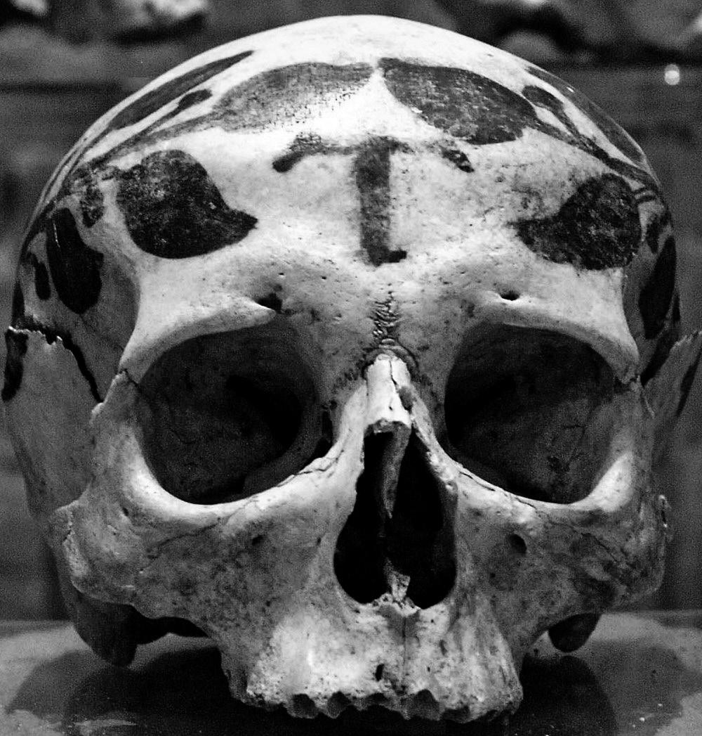 „Možná, že by se podařilo trochu poodhrnout roušku tajemství dvanácti dekorovaných lebek, kdybychom dokázali vysvětlit symboliku kresby, především písmene T uprostřed čelní krajiny. Je možné, že se jedná o poslední písmeno hebrejské abecedy – tav – a byly takto označeny lebky osob, které měly být spaseny.“