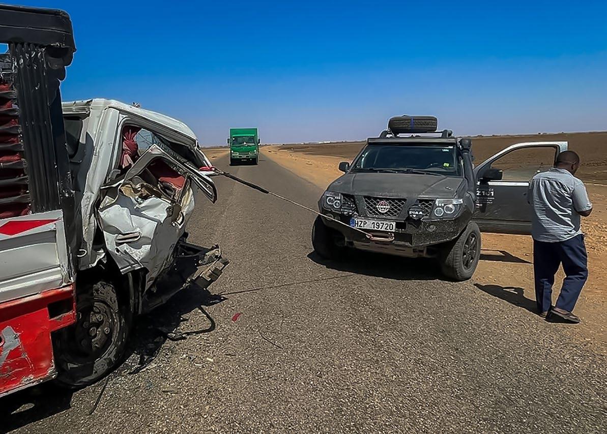 Uvolnil jsem páku navijáku, vytáhl lano a umístil hák na trám spojující masku a strop kabiny. Muž natlačený na stěnu byl v šoku a jen těžko reagoval. Při kotvení háku jsem si bohužel všiml, že kabina slisovala ještě dalšího muže, jehož tělo leží bez známek života pod sedadlem a je natlačené na rozpálený motor vozu. Teď bylo hlavní vytáhnout toho, co přežil, a tak jsem naskočil do George, křikem jsem udělal místo kolem kabiny a velmi pomalu, aby úlomky ocele nebo skla tržením navijáku někoho neporanily ještě více, jsem odbrzdil George a dálkovým ovládáním jsem napjal lano navijáku. V okamžiku, kdy lano začalo klást odpor, jsem zabrzdil a pustil naviják naplno. Kabina se začala otevírat. V tento okamžik jsem věděl, že toho kluka dostaneme ven, ale ihned se mi v hlavě vyrojila myšlenka, že jak otevřeme zbytek kabiny, tak to druhé tělo „vyteče“ do motoru. Beztak ale nebyla jiná možnost a bojovali jsme tady o život. Co se má stát, stane se. George táhl kousek po kousku silou 3,5 tuny ocele ze sevření, aby za necelou minutu bylo hotovo. Na vůz se nasypalo snad deset mužů ve snaze dostat toho kluka ven a já jen seděl za volantem a držel naviják, aby to nezmáčklo nikoho dalšího. Koutkem oka jsem viděl, jak nejprve vyndávají mrtvé tělo a teprve poté se derou k muži ve žluté džalábíji. Přes snahu soustředit se jsem vnímal, že se kolem mrtvoly v jednu chvíli strhl obrovský povyk, nato tělo doslova hodili do korby jiného vozu a odjeli. Teď už bylo vše vyřešeno. Kluk v džalábíji zůstal na místě a rozdýchával šok. Řidič druhého vozu je prý v pořádku a nic se mu nestalo. Kolem cesty sedí plačící ženy zahalené v hidžábech a muži se v panice modlí. Jakékoliv řešení situace je tady složité, protože místní jdou cestou, kterou jim předkládá Alláh. Dalším krokem tedy bylo odstranit naviják a pokračovat v cestě. Tady jsem udělal, co šlo, a dál je moje přítomnost zbytečná. Obrovský tlak, kterým jsme vyprostili kabinu, zaklínil hák do trámu z ocele. Při pokusu o jeho vyproštění jsem byl odstrčen a bylo mi naznačeno, že já pracovat nebudu! Moc jsem to nechápal, ale někdy mám dojem, že Súdánu nerozumím vůbec.