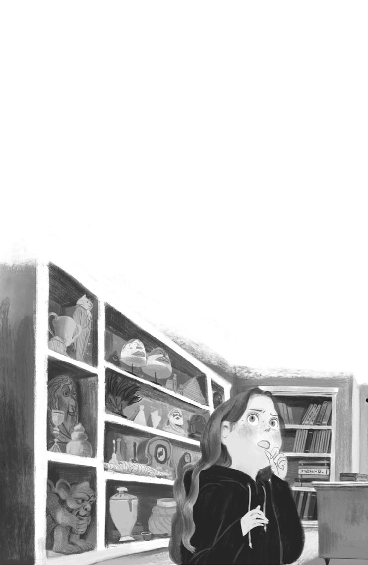 Enid, prateta Avinej mamy, bola slávna a scestovaná archeologička a v tejto miestnosti sa nachádzala jej súkromná zbierka kuriozít –nezvyčajných predmetov, ktoré jej za tie roky niekto daroval alebo ich sama našla. Keď prateta