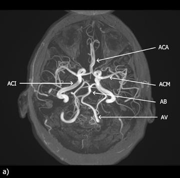 Srovnání MR a CT angiografie. MR angiografie mozku, metoda time-of-flight (TOF), rekonstrukce maximum intensity projection (MIP) (a); CT angiografie mozku, 3D rekonstrukce (b).