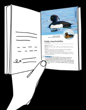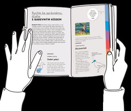 BAREVNÝ KÓD jednotlivých skupin ptáků slouží k co nejrychlejší orientaci v knize. Ptačí říše oplývá obrovskou rozmanitostí barev, tvarů a velikostí, díky barevnému kódu však snadno naleznete správnou cestu k určení neznámého druhu. Každá barva označuje jednu skupinu typově podobných ptačích druhů. Členění jednotlivých skupin se nachází vždy na začátku dané barvy a představuje další vodítko ke správné identifikaci, neboť v každé podskupině stačí porovnat již jen několik málo druhů. Popisky v obrázcích pak upozorňují na nejdůležitější určovací znaky. Za pozornost však stojí také popis hlasového projevu každého ptáka a další přínosné informace v textu, které se týkají obvyklého způsobu jeho chování při vyhledávání potravy a během hnízdění.