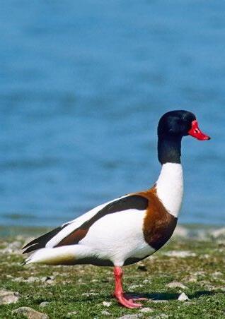 CHARAKTERISTIKA: 55–65 cm • velký a nápadně zbarvený pták; bílá základní barva, tmavě zelená hlava a křídla, rezavě hnědý pás na hrudi, výrazně červený zobák • na pobřeží si k hnízdění vybírá hlavně podzemní dutiny a nory, ve vnitrozemí také dutiny stromů • ptáci hnízdící v jižní a západní Evropě se shlukují ke společnému pelichání ve Waddenském moři.