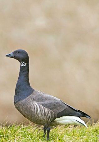 CHARAKTERISTIKA: 55–62 cm • malý pták s černým krkem, tmavě šedým hřbetem a bílou zadní částí těla • ozývá se hlubokým a drsným „rot rot rot“ • hnízdí v severosibiřské tundře, zimuje na slaniscích v jižní části Severního moře • především v období od března do května tvoří velká hejna ve Waddenském moři.