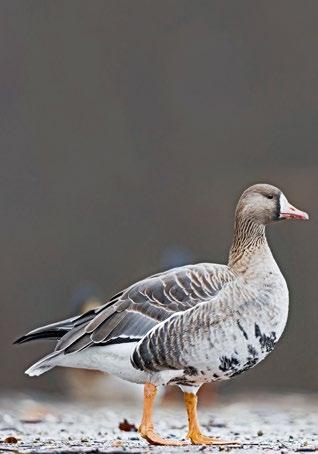 CHARAKTERISTIKA: 64–78 cm • poměrně malý šedý pták s bílým čelem a tmavými příčnými skvrnami na břiše • ozývá se štěkavým voláním ve vyšších tónech • hnízdí v sibiřské tundře; zimuje na polích a loukách na severu střední Evropy • večer se celá hejna slétávají na vodních hladinách, aby zde strávila noc.