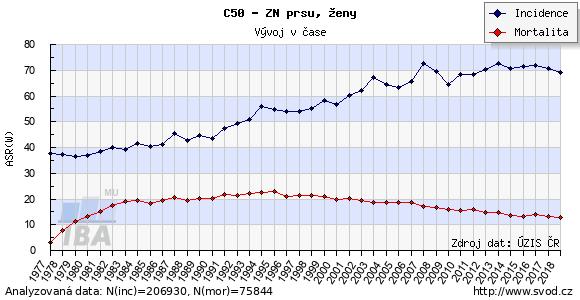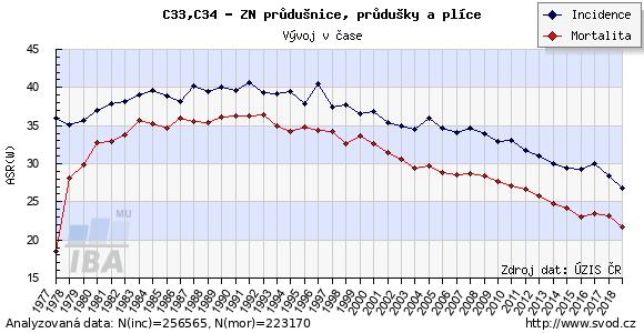 Obr. 1.2 Příklad nádorového onemocnění s klesající incidencí a setrvalou mortalitou (Ústav zdravotnických informací a statistiky ČR: NOR, 9. 9. 2014)