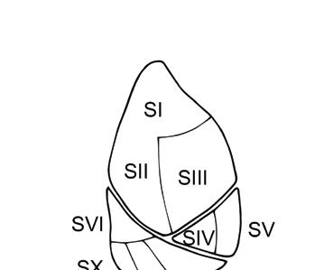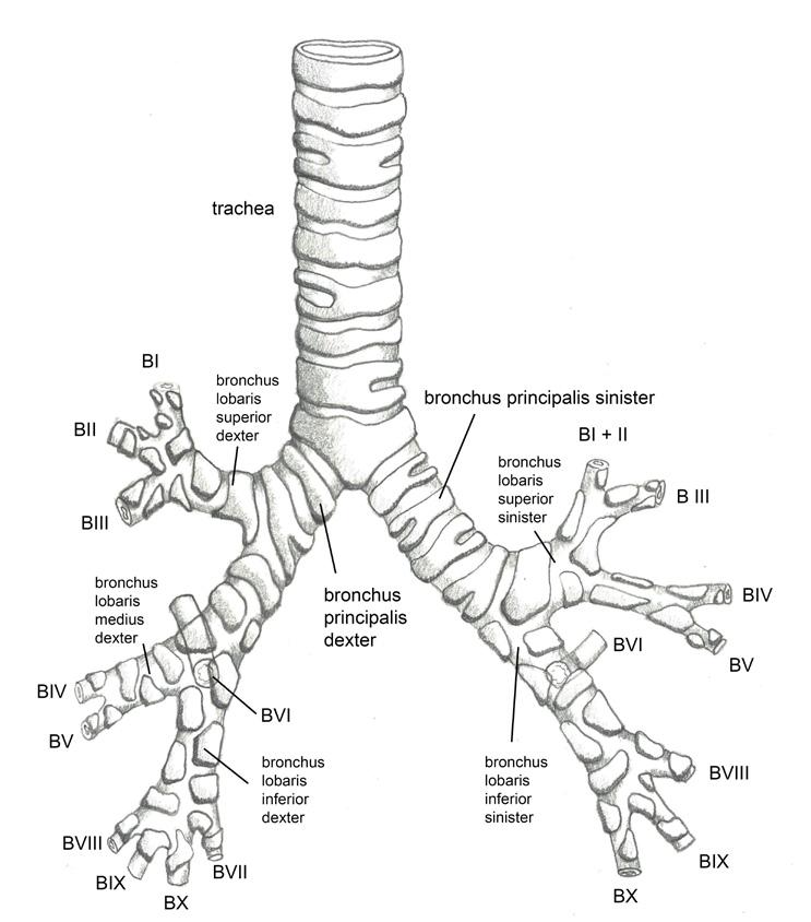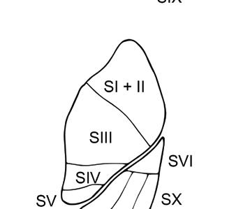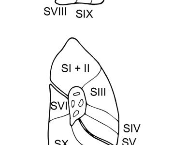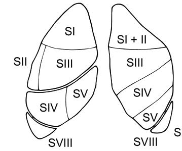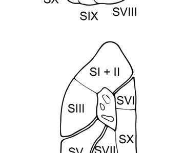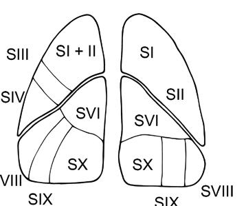 Tu lze dovodit na základě našich znalostí nebo doplněním snímku v bočné projekci. Na rtg snímku hodnotíme transparenci (zvýšená, snížená, přiměřená), stíny (světlé odstíny) a projasnění (tmavé odstíny). Při jejich lokalizaci hovoříme o tom, kam se promítají. U plic rozlišujeme horní, střední a dolní plicní pole, která jsou oddělena pomyslnou horizontální čárou spojující ventrální konce druhých (horní – střední plicní pole) nebo čtvrtých (střední – dolní plicní pole) žeber (obr. 5.1). Na rtg snímku jsou patrna pouze rozhraní útvarů o různé sytosti – vzduch, tuk, solidní tkáně, kost, kov. Rozhraní sousedních tkání se stejnou sytostí splývají a nejsou patrná. Svazek záření, který vystupuje z ohniska rentgenky, je rozbíhavý. Proto jsou struktury blíže k rentgence mírně zvětšeny. To je patrné zejména u stínu srdce a mediastina, které jsou v předozadní projekci relativně větší a sumují se s plicním parenchymem ve větším rozsahu. Proto je snímek hrudníku prováděn tam, kde to lze, v zadopřední projekci a vestoje. U malých dětí (novorozenců, kojenců a mladších batolat) je snímek obvykle prováděn vleže jako předozadní.