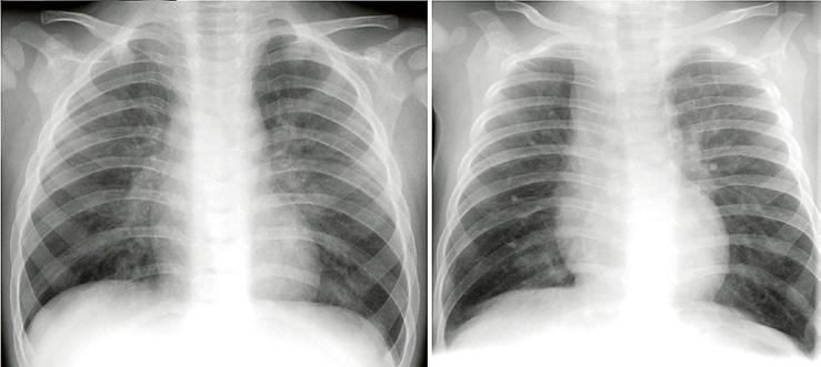 (obr. 5.2). Pokud je u bronchiolitidy nález na rtg, lze pozorovat hyperinflaci v periferii, ploténkové atelektázy a mírně sníženou transparenci, nejčastěji perihilózně (obr. 5.4). Rovněž i u intersticiální pneumonie může být rtg obraz normální. Je-li snížená transparence, zastření může mít intersticiální charakter s retikulonodulární kresbou, často je ale i podíl alveolárního postižení.