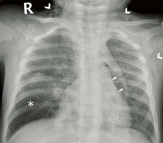 Obr. 5.5 Aspirace cizího tělesa. V pravém dolním plicním poli je zvýšená transparence v důsledku hyperinflace (*) při záklopkovém efektu cizího tělesa, pravé plicní křídlo má celkově větší objem a mediastinum je mírně posunuto doleva. Proužek vzduchu mezi tymem (→) a mediastinem jako obraz pneumomediastina, dále podkožní emfyzém na krku a v levé axile (>). (archiv Radiodiagnostické kliniky VFN a 1. LF UK)
