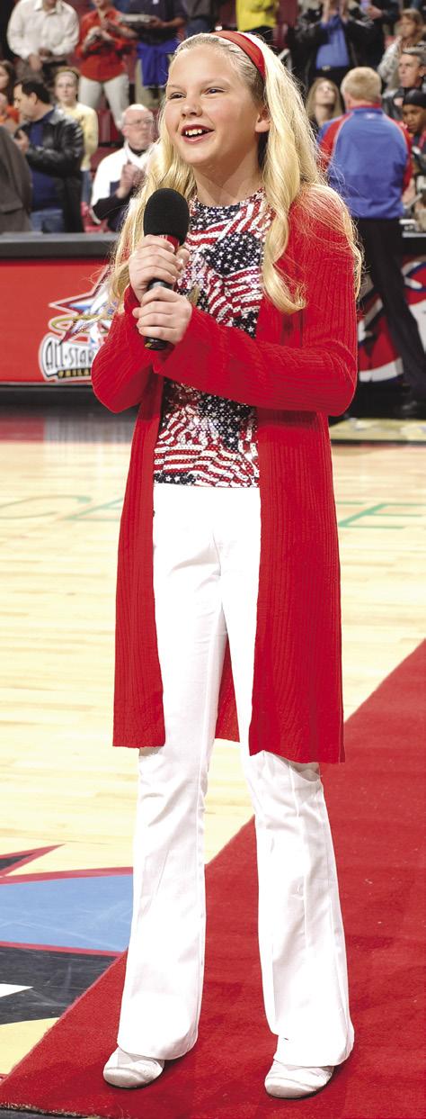 Miss Junior Americana. Jedno z prvních Taylořiných vystoupení bylo právě tohle sólo. Na místním sportovním utkání zpívala státní hymnu na počest Philadelphia 76ers v zápase proti Detroit Pistons. Už ve svých třinácti letech se dokázala do všeho opřít – včetně patriotismu, který tímhle svým outfitem dala zcela jasně najevo.