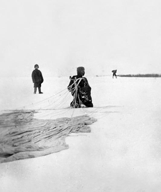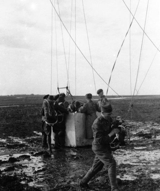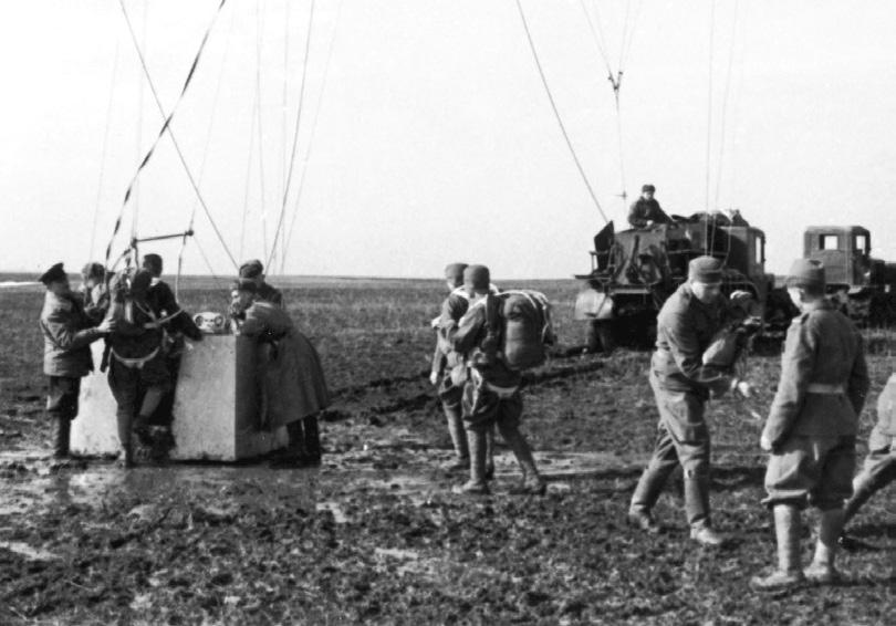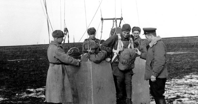 Nyní už do gondoly nastupují tři českoslovenští vojáci s hlavními i nouzovými padáky. Vzhledem k tomu, že na levém boku nesou i samopal PPŠ, jedná se minimálně o jejich druhý seskok. Vedle pravé ruky vojáka ve dvířkách vidíme palubní desku s výškoměrem a dalšími přístroji. Vpravo stojí navijáková souprava na nákladním automobilu, s jejíž pomocí byl balón výškově ovládán. Před automobilem je připraven i pásový traktor, který v případě silného větru může automobil jistit a pomáhat s pohybem po rozbahněném poli. (VÚA-VHA)