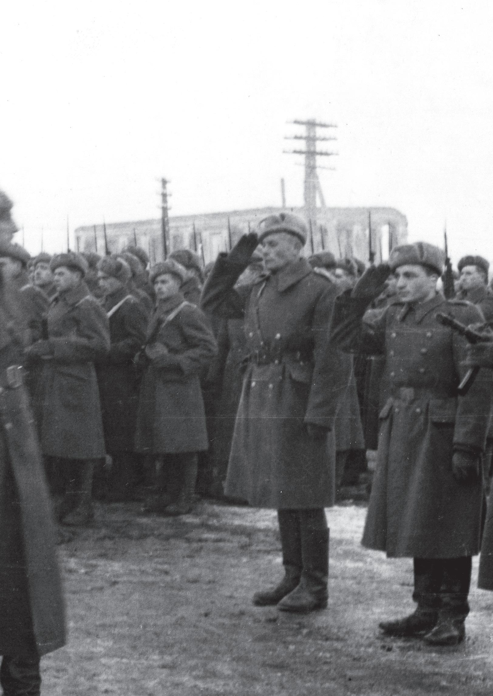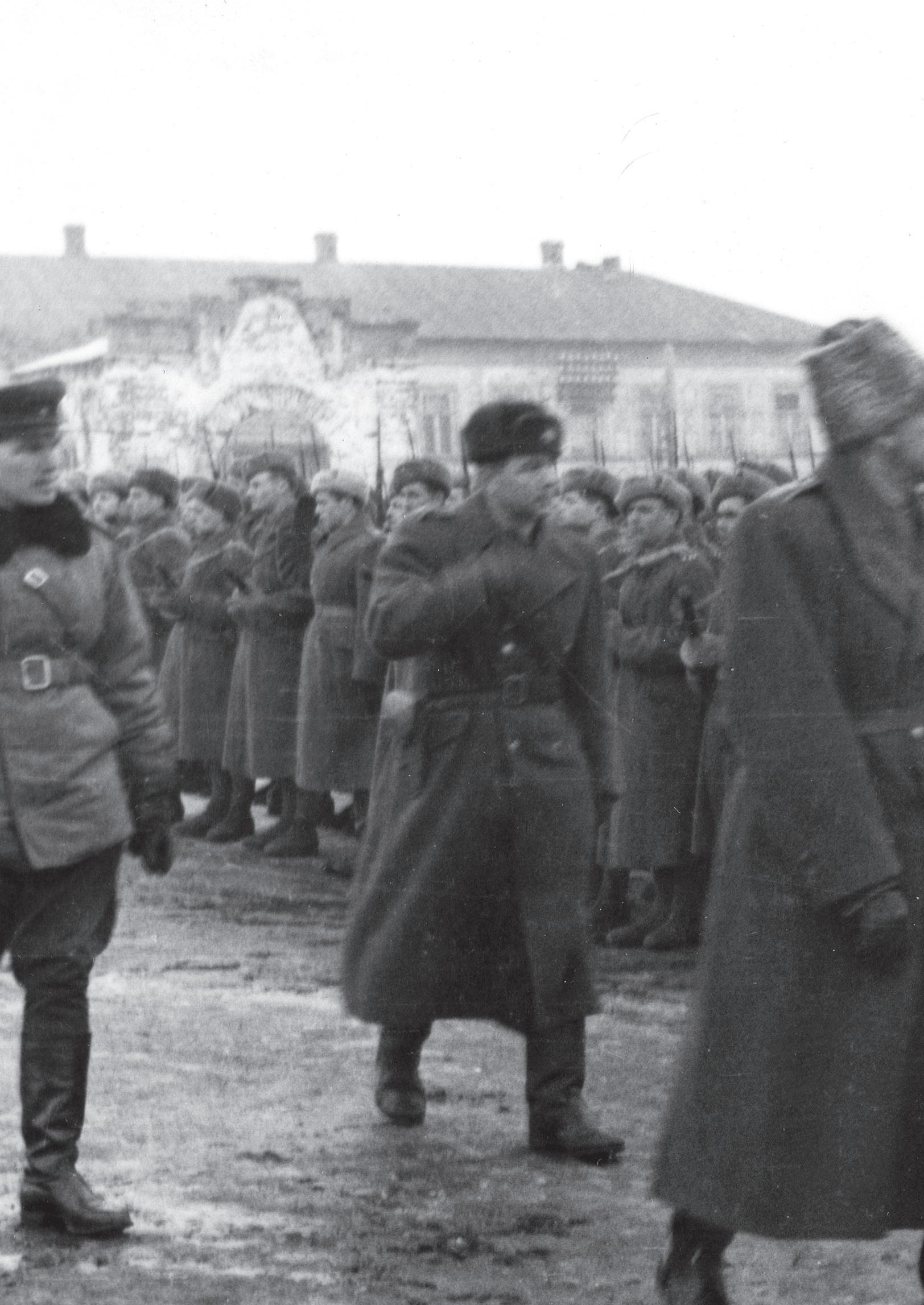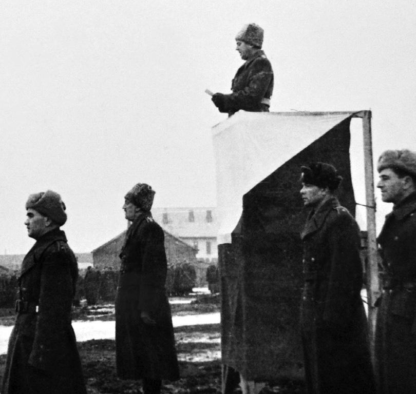 Společný nástup příslušníků 2. čs. sam. brigády a náhradního praporu dne 16. února 1944 v Jefremově. Z tribuny promlouvá zástupce velitele 2. čs. brigády pplk. Viliam Lichner, pod tribunou zleva stojí velitel náhradního praporu pplk. Karel Střelka, velitel 2. čs. brigády pplk. Vladimír Přikryl, náčelník štábu brigády škpt. Vilém Sacher a přednosta operačního oddělení štábu kpt. Karel Hlásný. (VÚA-VHA)