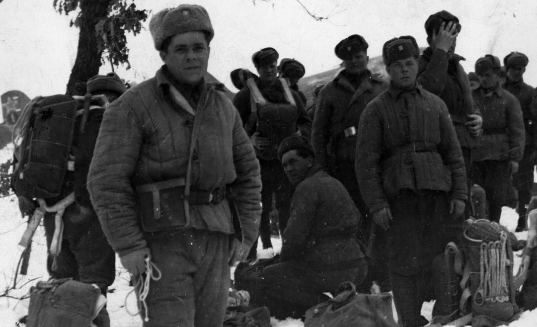 Seskoky padákem zahajovali důstojníci parabrigády už 12. února 1944. Kromě asi dvou desítek českých důstojníků, kteří absolvovali parakurz ve Velké Británii, měl zbytek s padáky nulovou zkušenost. Na snímku z března si můžeme prohlédnout skupinku příslušníků dělostřeleckého oddílu, která se chystá ke druhému seskoku, protože u některých parašutistů vidíme část pažby samopalu PPŠ-41, umístěného podél levého boku. V první řadě zleva v plášti por. Karol Kraľko, v polokožichu npor. Jozef Figura, neznámý důstojník s padákem, por. Ján Mráz též s padákem a s rukama v kapsách, v polokožichu npor. František Fišera. Fotografie poskytuje i dobrou představu o velikosti záložních padáků PZ-1. (AM-SNP)