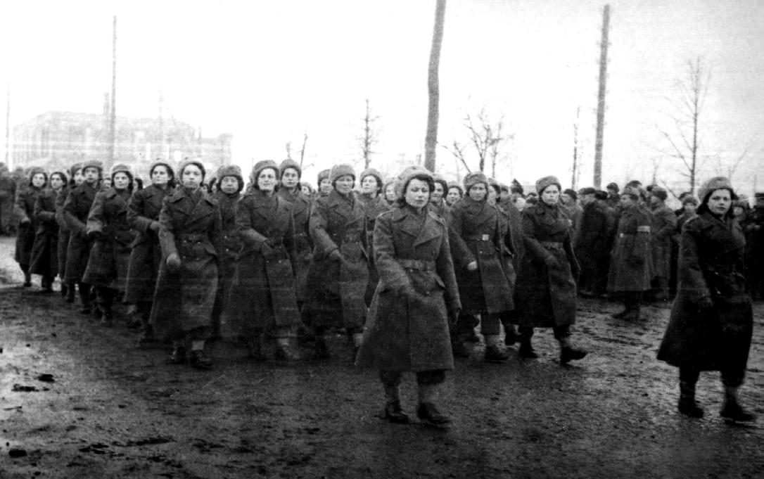 Pochodový útvar více než čtyř desítek žen, pravděpodobně výcviková četa náhradního praporu, vede „sokolovačka“ des. Adéla Fischlová (vpravo) a neznámá poddůstojnice (vlevo). Adéla Fischlová ukončila válku v hodnosti podporučíka jako příslušnice 6. oddělení (šifrovacího) štábu 1. čs. sboru. Jefremov, zima 1944. (VÚA-VHA)
