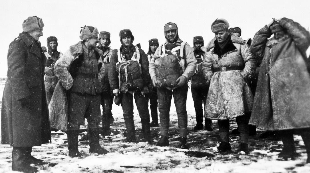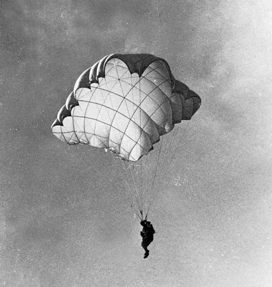 Na tomto záběru zespoda vyniká charakteristický čtvercový tvar sovětského padáku PD-41. Často bývají publikovány fotografie s tématem hromadného seskoku, které jsou označovány jako snímky 2. čs. parabrigády, byť padáky na nich mají tvar kulového vrchlíku, opatřeného kamufláží. Ty byly pořízeny až po válce s československými padáky typu VJ-1. (VÚA-VHA)