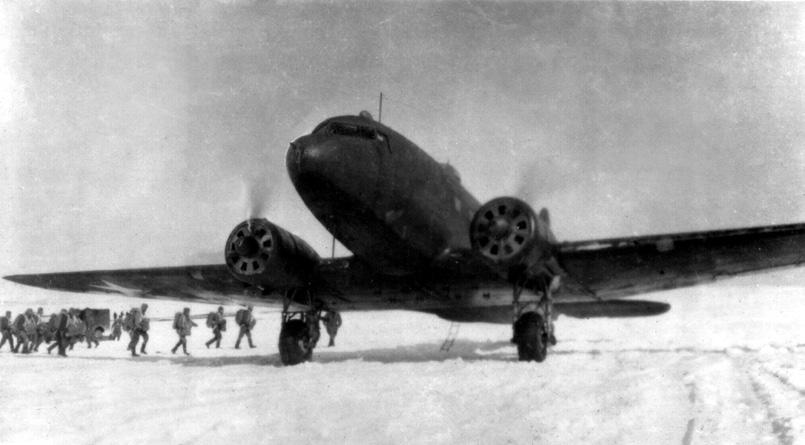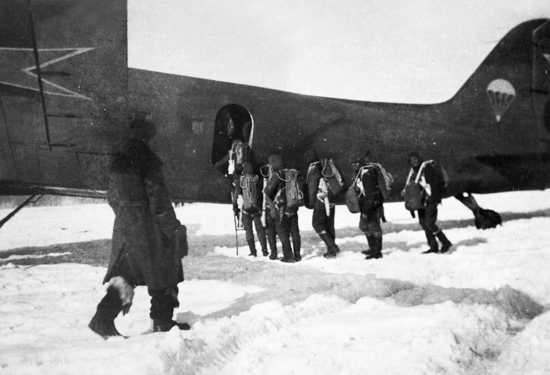 Po seskocích z balónu následovala další část výcviku, představovaná seskoky z letounu Lisunov Li-2 (jak vidíme, na hřbetě letounu je patrná střelecká věž s kulometem UBK), zpočátku po četách a později i v rotách, a to z výše 600 metrů. Jefremov, přelom března a dubna 1944. (Sbírka Milan Kopecký)