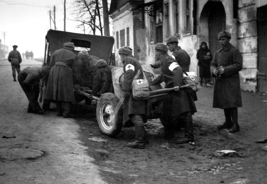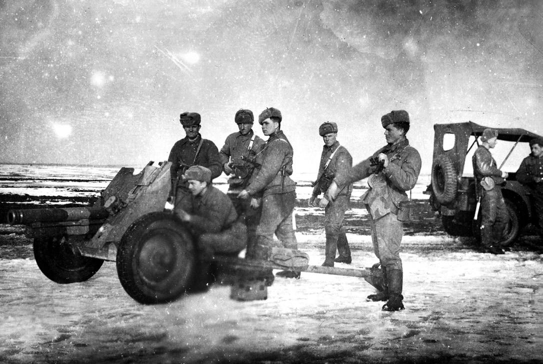 Když nestačí fyzická síla čtyř dělostřelců a rady pátého, který stojí na chodníku (obsluhu tvořilo šest mužů), pomohou se zapřažením 45mm protitankového kanónu vz. 1937 za terénní automobil Jeep Willys tři zdravotníci. Záběr není nijak aranžován, protože zdravotník vlevo si ani neodložil drátěnou dlahu. Jefremov, březen 1944. (VÚA-VHA)