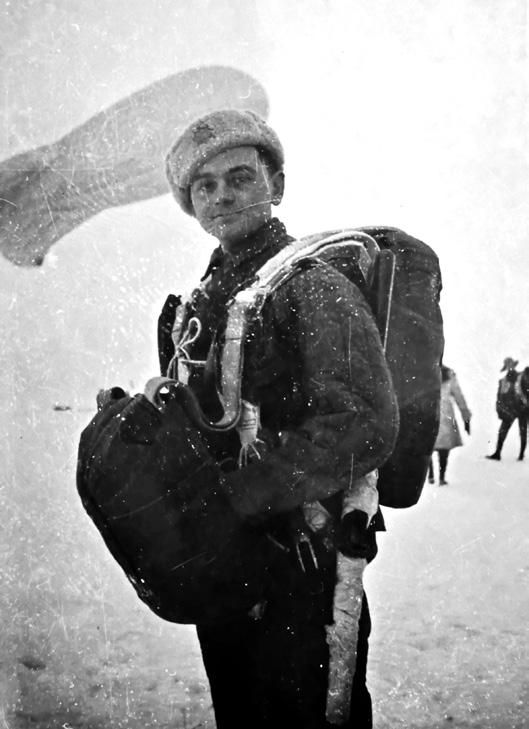 Kpt. Viliam Pavlovič je připraven k seskoku z balónu. Kromě hlavního a záložního padáku má na boku připevněnou zbraň – samopal PPŠ-41. Ten je bez zásobníku, ovinut látkou bílé barvy, která jej chrání, ale i maskuje. Jefremov, dopoledne 14. února 1944. Datum je stanovené podle zápisků kpt. Pavloviče, který si tehdy poznamenal: „V 10.20 hod. previedol som treti skok – vyška 400 m. Padak sa ťažko otvaral. Bol vietor – pristal som blizko domov a viezlo ma to trochu po pristani po zemi asi 5 m. Pristanie bolo však makke a lepšie včerajšieho skoku. Skakal som v plnej vystroji so zbraňou /automat, nagan a finska dyka.“ (VÚA-VHA)