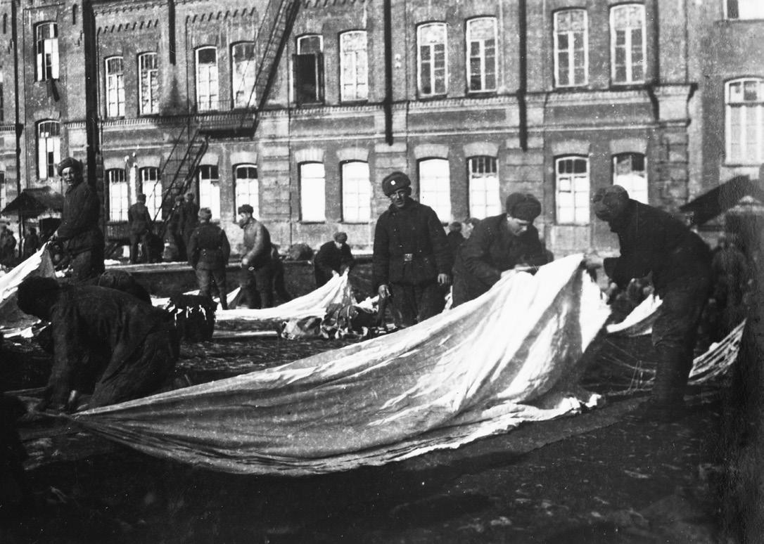 Skládání padáků na nádvoří kasáren M. R. Štefánika, jak byl komplex objektů pojmenován rozkazem 2. čs. samostatné brigády. Podle vatovaných součástí výstroje na většině vojáků pochází fotografie z března či začátku dubna 1944. Architektura budovy v pozadí odpovídá industriálnímu stylu z přelomu 19. a 20. století a zajímavý je i výskyt externího požárního schodiště. (AM-SNP)