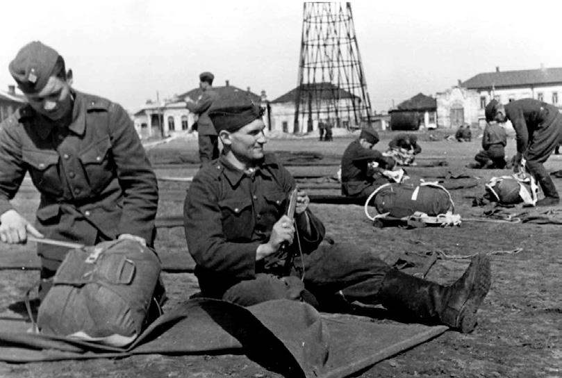 Bližší záběr na balení padáků už ukazuje některé zajímavé detaily. Voják vlevo si na polní čapku připevnil svobodnickou „pecku“, což bylo v čs. jednotkách v SSSR zakázáno, zřejmě proto, že takový lesklý bod či body demaskovaly vojákovu hlavu a tvořily dobrý cíl pro nepřátelské střelce (čepicový odznak býval zpravidla mořený, a tudíž méně viditelný). Voják napravo od něj si upravuje délku tkanice sovětským průzkumnickým nožem vz. 40, tzv. „finkou“. (VÚA-VHA)