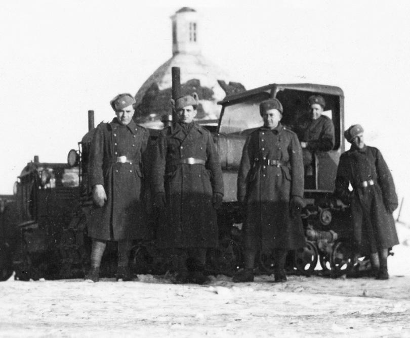 Zde vojáci parabrigády pózují před traktory typu STZ-3, používanými u navijákové soupravy. Jak vidíme, v Jefremově se nacházely nejméně tři stroje tohoto typu. Vozidlo na obrázku je vybaveno novějším typem kabiny. Traktor původně vznikl jako zemědělský stroj, ale za války byl masově využíván především u dělostřeleckých útvarů Rudé armády. Jeho hmotnost činila 5 100 kg a výkon motoru dosahoval 52 ks při 1 250 ot./min. (AM-SNP)