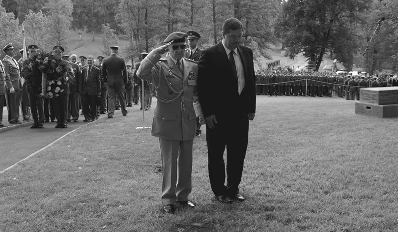 Čestný předseda ČsOL arm.gen. v.v. Tomáš Sedláček a současný předseda plk. v.z. Pavel Budinský při pietním aktu v Ležákách v roce 2012 (sbírka ČsOL)