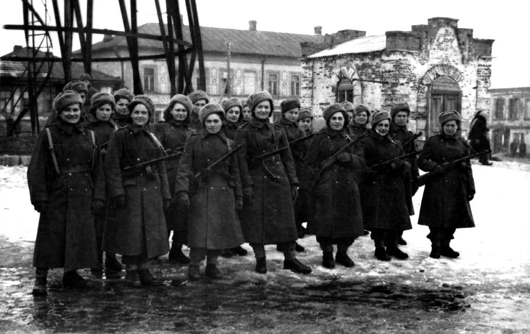 Velká část žen, které se v Jefremově před pár týdny staly příslušnicemi 2. čs. samostatné brigády a mnohé z nich za necelé tři měsíce absolvují i parašutistický výcvik. V první řadě zleva des. Jana Lošťáková, svob. Marie Petruňová, svob. Terezie Čerepanová, svob. Richarda Wechsbergová, voj. Gertruda Raweková, svob. Terezie Rufeisenová a voj. Sára Weberová. Ve druhé řadě voj. Marie Ljachová, voj. Božena Fialová, voj. Ljuba Meierová, voj. Lydie Studničková a poté dvě další ženy, které zatím nelze identifikovat. Ve třetí řadě, která je už značně zakrytá předchozími, můžeme určit voj. Margitu Novosadovou (za levým ramenem L. Studničkové) a voj. Helenu Sotákovou, která řadu uzavírá. Za skupinou vidíme spodní část věže pro cvičné seskoky. Snímek byl pořízen dne 16. února 1944. (VÚA-VHA)