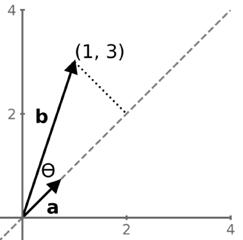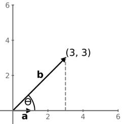 vektoru a se značí ‖a‖ nebo |a|. Projekce vektoru b do směru vektoru a je dána neboli ‖b‖ vynásobenou kosinem úhlu mezi oběma vektory. Mezi vektory, zvolili, je úhel 45 stupňů (neboli ���� 4 radiánů), jak je znázorněno výše v grafu.