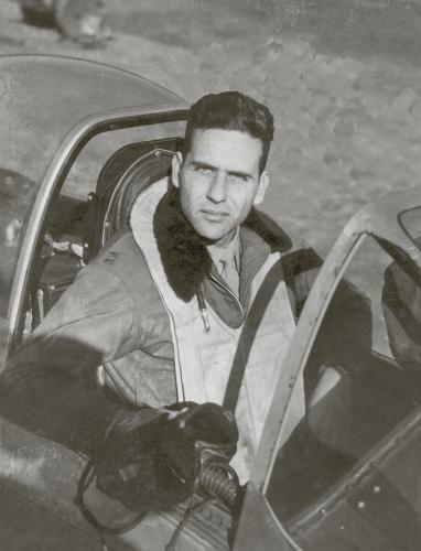 Ralph Cox, který vedl 369. squadronu při útoku na letiště Moryń. Na snímku sedí v kabině svého letounu P-51K