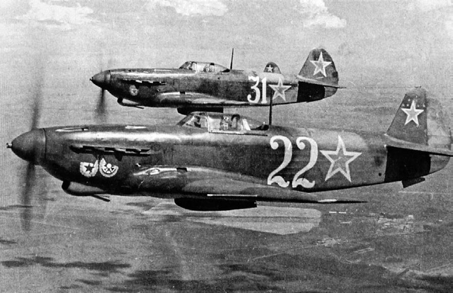 Dvojice sovětských Jaků-9D. Letoun měl dřevěnou kostru potaženou překližkou a šlo o stroj zcela jiné koncepce než americké stíhačky P-38 Lightning (viz foto vlevo). 6 | První akordy studené války