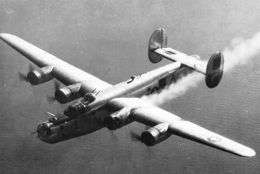 B-24 Liberator ztrácející palivo po zásahu do motoru