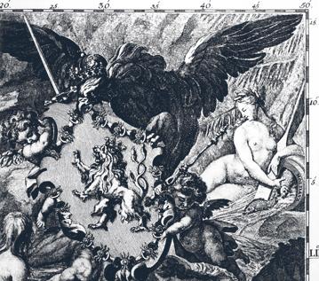 Personifikace Vltavy doprovázející kartušový štít s českým lvem na Müllerově mapě Čech z roku 1720. Výzdoba jedné z nejvýpravnější z historických map Českého království je dílem rytce Michala Kauffera