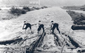 Plavci u příďových vesel při proplouvání propusti v Letoštici. Vlevo vrátný Václav Štědronský ze Zbonína, dále Josef Štědronský a Matěj Mašek, oba ze Štědronína. Asi rok 1958