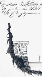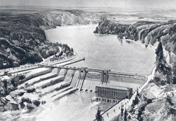 Tak měla vyhlížet 41 m vysoká přehrada, projektovaná ve dvacátých letech nad hotelem Záhoří. Na kresbě vidíme, že elektrárna je tu situována na levý břeh, rozsáhlá plavební komora na pravý. V této části hráze měly být čtyři regulovatelné přepady určené k odchodu velkých vod. Projektanti zde přišli se zajímavým návrhem stupňovitě upravit tento odtok tak, aby se řeka dostala na skalní stěnu a tady vytvořila impozantní vodopád. Jak víme, pováleční architekti už takový smysl pro romantiku neměli a zřejmě ani mít nemohli. Na přehradě posunuté od Záhoří níže do Svatojánských proudů a pojmenované Slapská se nezřídila ani tolik potřebná plavební komora