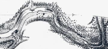 Ukázka z Eberlovy mapy Vltavy z roku 1777, úsek pod Červenou. Na teto mapě jsou v originále barevnými pruhy vyznačeny v té době prováděné regulační práce uskutečněné v letech 1766–1773, 1774–1776, ty dokončené v roce 1777 a právě rozestavěné