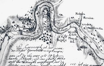 Na mapě vidíme, jak v Týně tyto náplavy a mělčiny (označené „B“), vzhledem k umístění propustí v jezech silně vadily plavbě. Mapa byla podkladem k pracem, které pak plavební koryto prohloubily. Přerušovaná čára vyznačuje potahovou stezku
