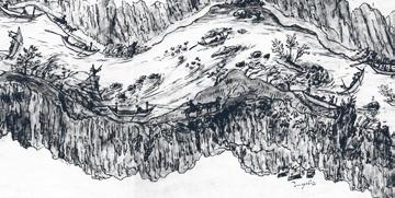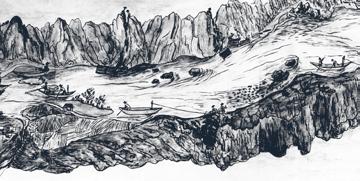 Tento úsek Altmannova panoramatu ukazuje místo, které bylo pro plavce na celé Vltavě odnepaměti nejnebezpečnější. Při pravém okraji kresby vidíme skálu Sedlo, od níž pokračuje bezmála až k protějšímu břehu skalnatý jazyk. Vory a lodě mohly proplouvat jen úzkou průrvou s dravou peřejí – Hořejším slapem. Dalším nebezpečím byl Dolejší slap se skalnatým ostrovem Kubíčkem, kde se podle stavu vody museli plavci rozhodnout, obeplují-li jej zprava či zleva. Pokud vrátný na vorovém pramenu nerozhodl dobře a včas, mohlo to dopadnout, jak ukazuje obrázek