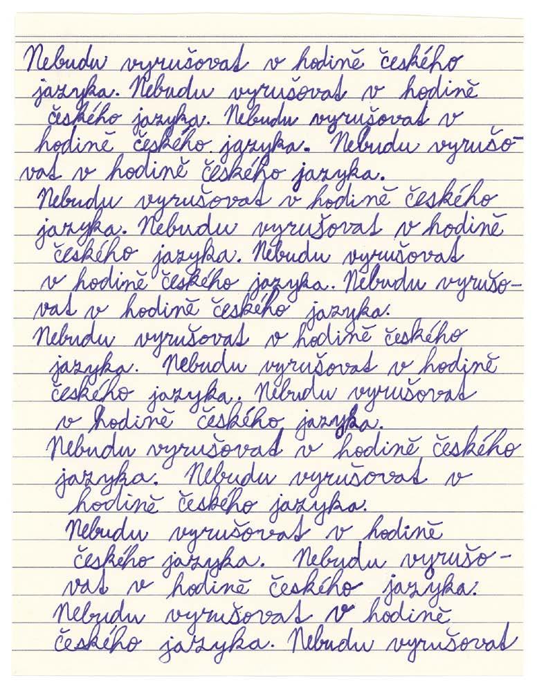 „A dost! Tady se nedá učit! Zbytek stránky si dodělejte sami. A zítra chci mít na stole od každého z vás papír, kde bude stokrát napsáno: Nebudu vyrušovat v hodině českého jazyka. Rodiče ať to laskavě podepíší.“ Nečekala na zvonění, sbalila si své věci a práskla dveřmi.