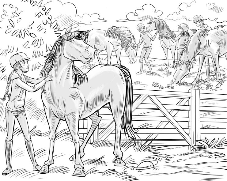 Amara sa rozhliadla okolo seba. Kalini, Imogen a Alex práve preliezali bránu vedúcu na lúku, v rukách držali ohlávky a tváre mali roztiahnuté do širokých úsmevov.