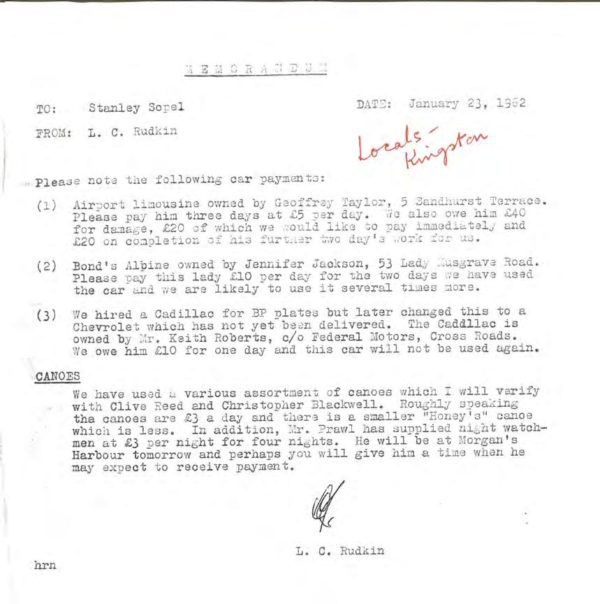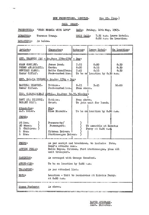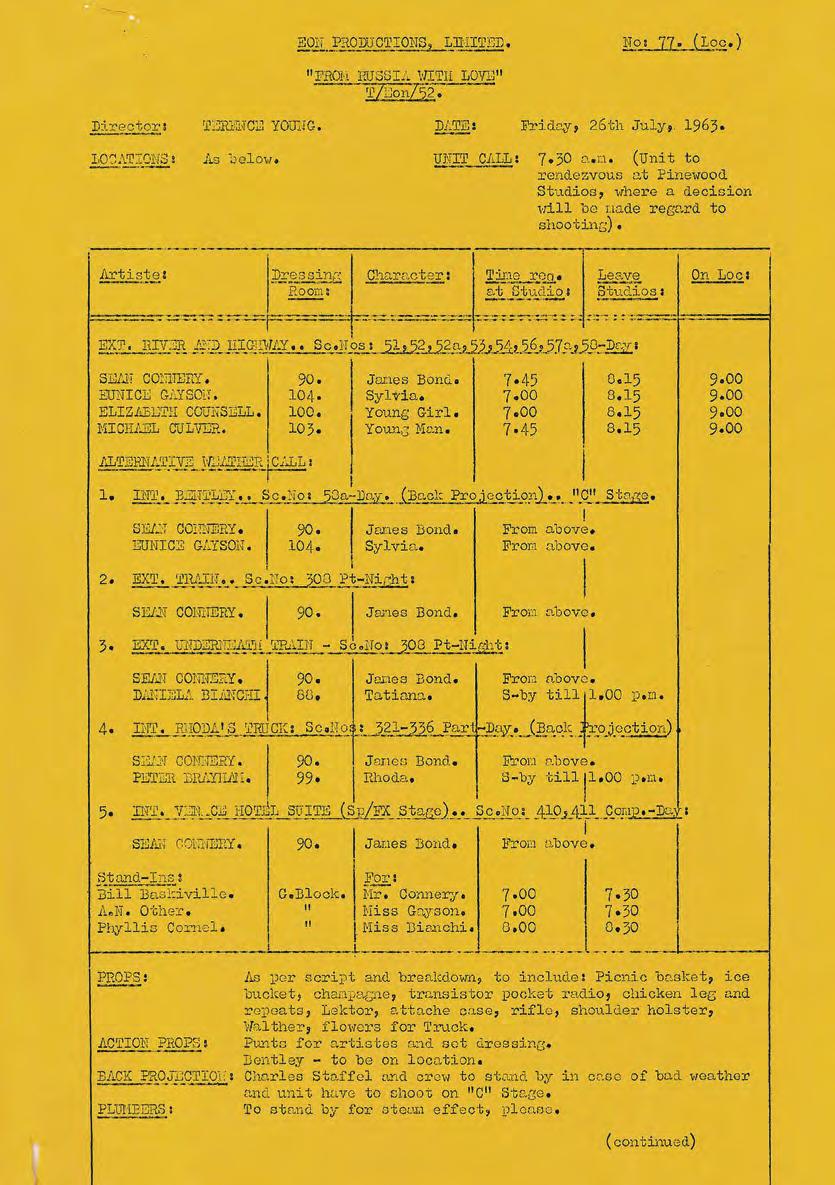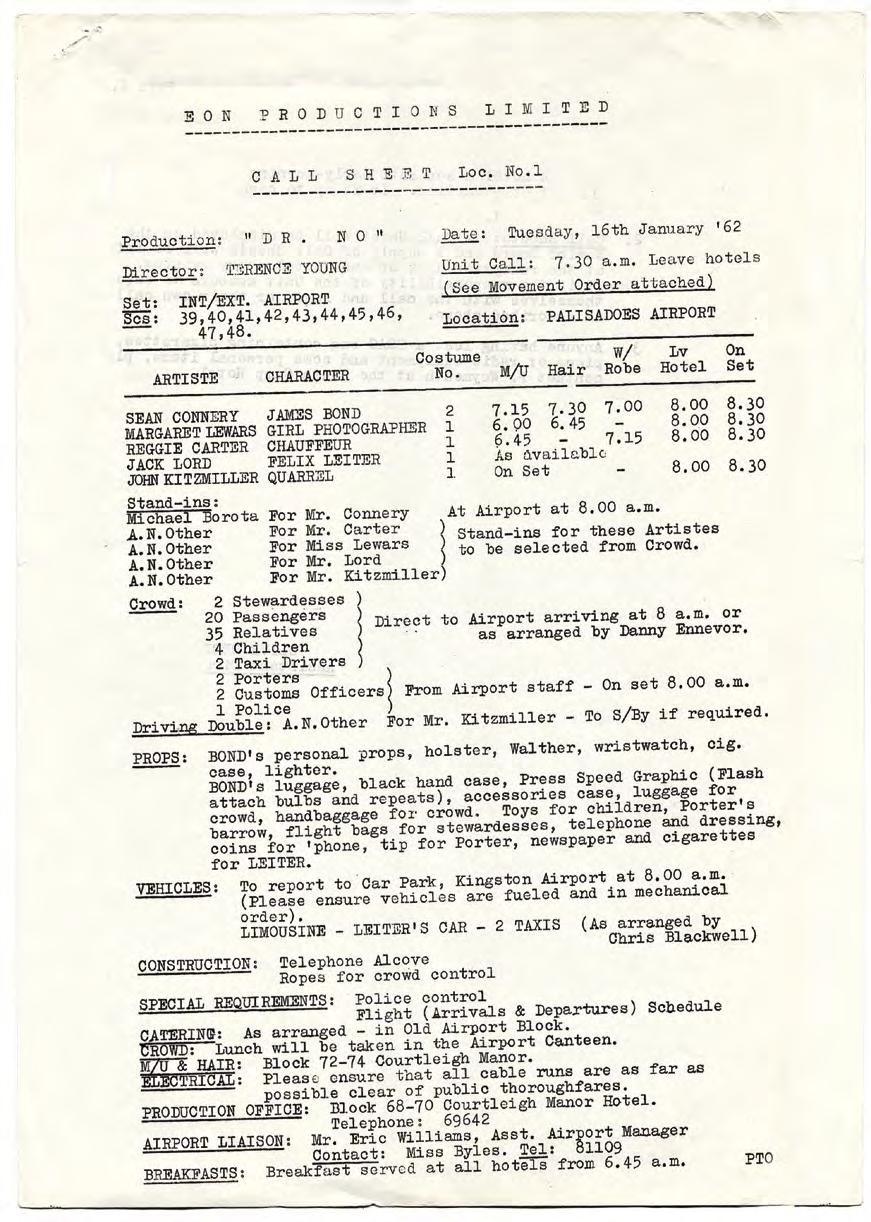 Seznam pro první natáčecí den bondovky Dr. No, úterý 16. ledna 1962. Vozidla měla být natankovaná a mechanicky v pořádku