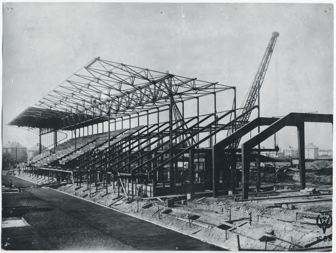 Na podzim roku 1937 byly zahájeny přípravné práce, na dokončení impozantní stavby stadionu neměla vliv změna politických poměrů na konci roku 1938 a v roce následujícím. Tribuna stadionu měla kapacitu 4 250 míst k sezení a 1 680 ke stání, ochozy ke stání mohly pojmout zhruba dalších 17 900 diváků. Na stadion tak mohlo přijít až 24 tisíc diváků. Celkové náklady na stavbu na stavbu přesáhly 11 milionů korun.