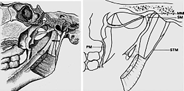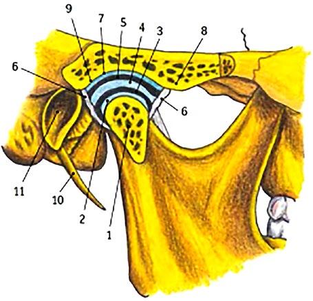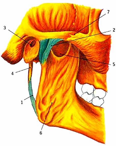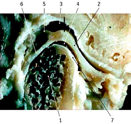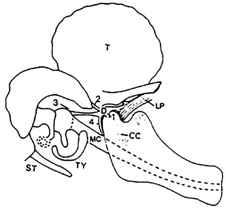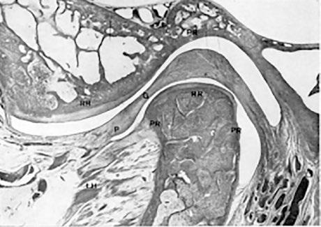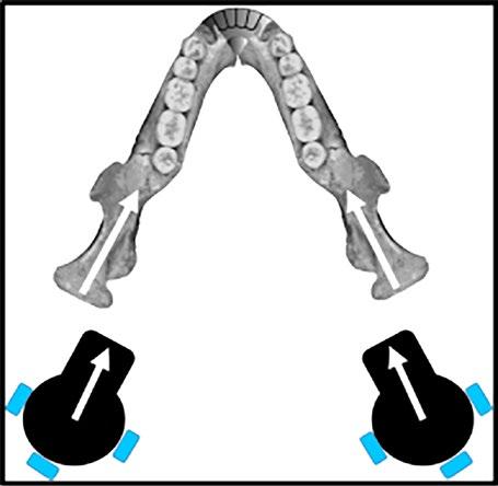 ními jednotkami, mezi hlavicí a diskem na jedné straně a mezi diskem a kloubní jamkou na straně druhé. Díky tvaru kloubních ploch a faktu, že jsou obě hlavice spojeny v jedné kosti, je možné provádění velkého množství pohybů – exkurzí mandibuly. Extrémní postavení hlavice a jamky je dokonce takového rozsahu, že nemá nikde jinde na těle obdoby. Při podrobnějším pohledu na kloub ve funkci zjistíme, že z oblasti kloubní jamky je nejvíce využívána dorzokaudální plocha tuberculum articulare. Při oproštění se od statického pohledu tak docházíme k závěru, že v obou funkčních kompartmentech kloubu vlastně dochází k pohybu chrupavkou pokryté konvexní plochy proti konkávní ploše discus articularis, což má pro pochopení patofyziologie poruch čelistního kloubu enormní význam. Při rotačním pohybu kondylu se kloubní disk stlačuje co do tloušťky. Při posuvných pohybech kondylu se kloubní disk vytahuje do délky a opět smršťuje. Většinou se pohyby mandibulárních kondylů kombinují.