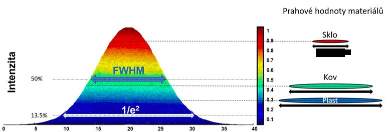 Obr. 4.3: Příklad gaussovského svazku s vyznačeným FWHM a průměrem v 1/e2 a příkladem změny průměru stopy svazku na povrchu různých materiálů