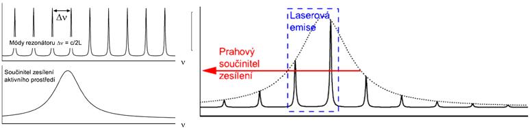 Obr. 3.2: Frekvenční rozložení módů rezonátoru a součinitele zesílení aktivního prostředí [11]