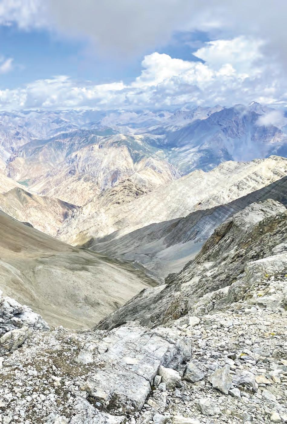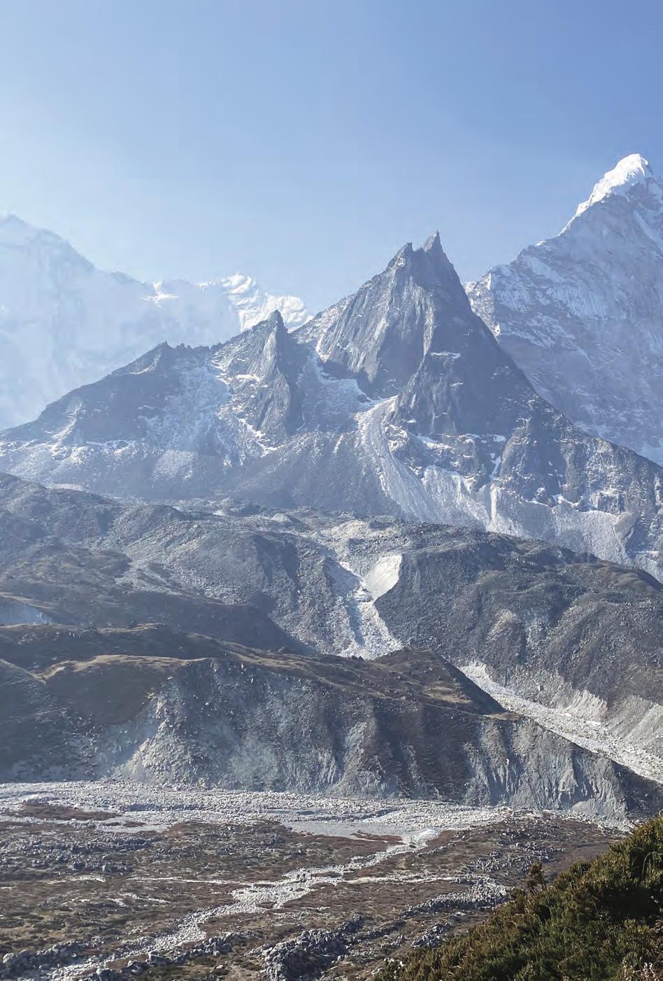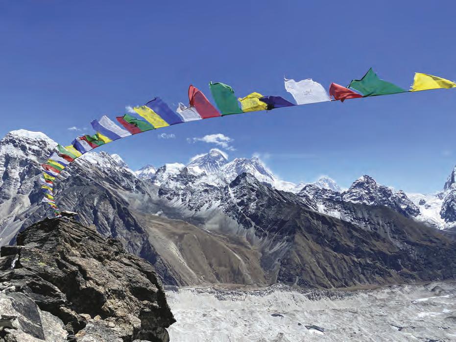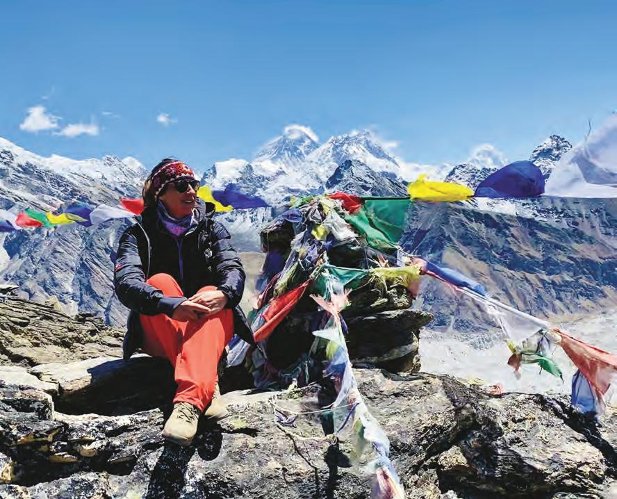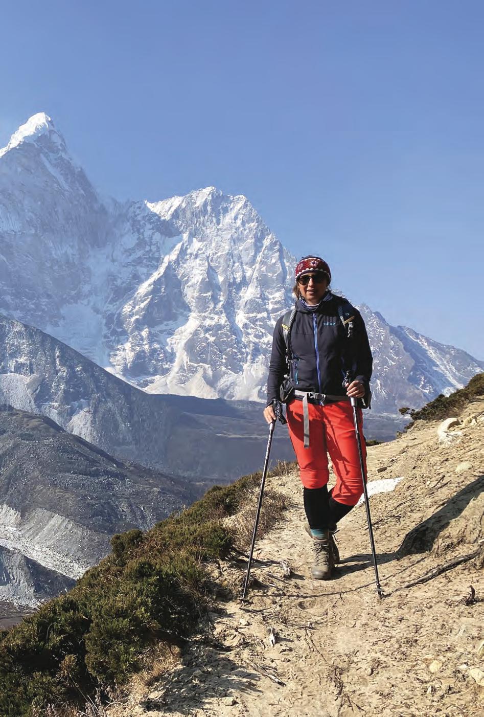 ného“ putování Himálajem, to celkem stačí ktomu, abyste se ocitli vpříjemném rauši, vněmž hrdinně odkývnete cokoliv. Však na mě leckdo znaší „zájezdové“ party, která se pustila do dvoutýdenní cesty přes tři himálajská sedla, taky trochu koukal skrz prsty, protože pro nováčky může být alkohol vtakové nadmořské výšce na úvod zničující. Ale já měla naproti sobě ustolu skvělou parťačku Radku, čilou padesátnici zHarrachova, která má Himálaj projitý skoro skrz naskrz. Chvíli jsem poslouchala její poutavé vyprávění oživotě, chvíli zase ona naslouchala mně. Otom, proč ředitelka ministerského odboru avědkyně dala během covidu –tedy vdobě, kdy chtěl mít každý nějakou jistotu – vpráci výpověď ateď se tu sama vláčí sbatohem po Nepálu. Jak dost trpí, protože doposud zlezla pětitisícovku jen jednou, byl to ikonický Ararat, atak si tu teď těžce zvyká na výšku ajen pomalu se aklimatizuje. Ale má cestovatelské sny, dokonce spoustu snů, znichž jeden nyní naplňuje. Už Ararat mi přinesl obrovskou euforii, akdyž jsme zněj sestupovali dolů, věděla jsem, že hory jsou mým osudem. Že je miluji, že vnich vidím velkou výzvu. Kančendženga