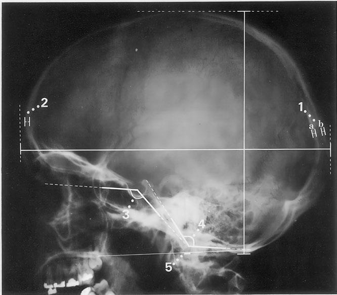 (3) úhel báze lebeční (nasion – tuberculum sellae – basion) = 123–152°
