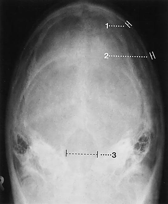 Pravidelný průběh a věku odpovídající zobrazení lambdového a dalších zachycených švů Struktura a mineralizace kosti normální Kalva je hladká a ostře konturovaná bez patologických přerušení kontinuity nebo linií fraktur