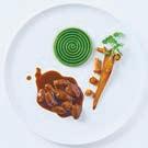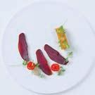 Pečené kachní prso s malinovým consommé, čekankou, mandlemi a pyré z bazalky a cukety 144